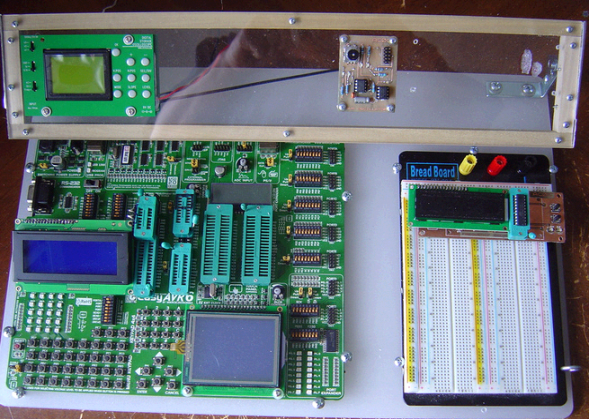 This system is based on the Mikro EasyAVR6 development board. Some features are built into the development board like LCD, LED, switches, AVR programmer interface, graphic LCD, serial LCD, bus expander and RS232 interface. What I've done is to take this and add to it basic instrumentation and a breadboard area. The idea is that the board makes it easy to test out software developed for an AVR chip without requiring the hardware to do the test be breadboarded as a seperate project. For more details on the Mikroe EasyAVR6, look here: http://www.mikroe.com/eng/products/view/321/easyavr6-development-system/ CONSTRUCTION DETAILS The EasyAVR6 is mounted on a plastic backing which further serves as the basing structure for the rest of the added components. From left to right, the LCD oscilliscope, the oscillator module, and sitting on top of the breadboard area, the DVM/frequency counter module (which will eventually be mounted to the right of the oscillator. The space between the oscilliscope and the oscillator will eventually hold a general purpose IO board with switches, speaker, rotary encoders, etc. The entire combination - along with the breadboard accessories - provides the basis for a complete test system.