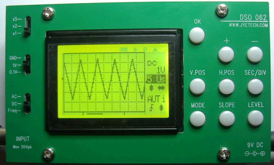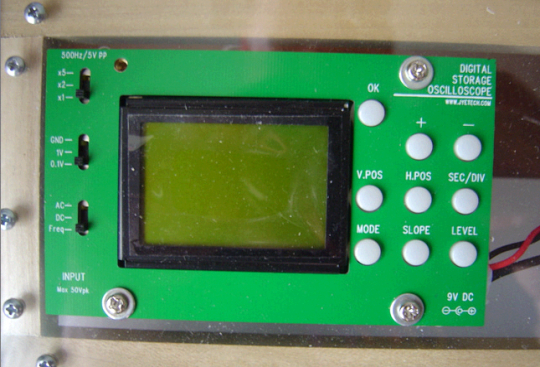 The oscillator board provides high current output in both Q and Q-not polarity. The rotary encoder adjusts the frequency from a range of about 120 seconds period up to about 100 Khz. High resolution is provided around the 600 hz AF filter range and around the 1 second clocking range. Frequency can be read by the DVM above. Or the user can cycle between 3 preset frequencies - 1 hz, 600 hz and 100 Khz - just by pushing down on the rotary encoder. LED's on the board indicate the status of the outputs as well as providing a visual feedback of rotary encoder revolutions. The most amazing addition is the JYTECH digital scope. This unit sells for just $50 assembled and has the most amazing range of features. It's mounted here flush to the plexiglass panel so all controls are accessable. Has a 1Mhz bandwidth, capable of sample and hold and has a basic spectrum analysis function via a FFT feature. Reads voltage and frequency directly. External trigger. Built in 500 hz 5V test signal.