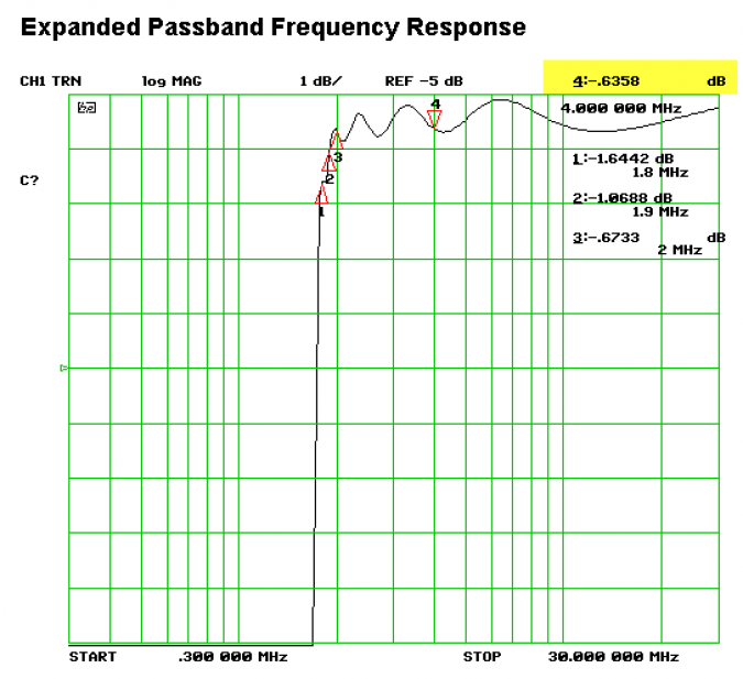 Internally, the box has a large amount of unused space. But that's an asset when dealing with high stopband levels - packing the circuit into a compact enclosure will likely create a compromise in the stopband performance. Note the coax is further decoupled with ferrites on each side. And the BNC jacks are shielded on the internal side to minimize the impedance "bump" of the connector as well as to optimize the isolation - micro level details come into play at the attenuation levels Jack's deliverying. I know from prior personal experience, to obtain the performance levels the design is capable of, the coil build must be exact. Orientation is a factor as well at these levels. Inductance levels must be trimmed to accuracy levels of under 1% and that hides the complexity of the board - it looks more simple than it is because the in-circuit value and tested values can easily have this amount of error. The only way around this is to correlate the performance and the tested values and offset accordingly. I'm uncertain what Jack's construction method is exactly - but little things like this are most certainly part of the "recipe." Advertised specifications pulled from Jack's web site are: - Filter Type: 9th order 1 dB Chebyshev.