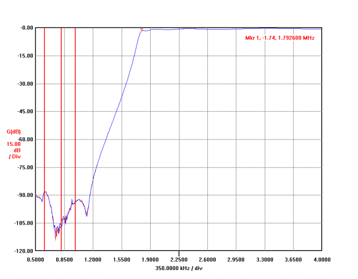 Z10022A Advertised Typical Performance Plot Analysis The objectives of the bench evaluation were to confirm the rejection claims made on Jack's web page. Looking at this plot for the 1.8 MHz loss of this plot pulled from Jack's site, the 1.6 db number is found on plot tick A (highlighted in yellow). Stopband attenuation is at the floor of Jack's plot indicating >100 db levels.  A 1 db Chebyshev design should have around 1 db of ripple in the passband. And on this chart from Jack's site we can get a feel for the ripple in the passband – around 0.75 db by “eyeball” interpolation… Data point #4 from the graph is at 0.6 db - within the 1 db designs expected range.  The last metric of interest on our tests today were input match. Here we can see SWR on Jack's data at 2:1 across the passband with a bit of a peak at 1845 KHz… Note that SWR match is really a "critical" metric from a receiver standpoint - in that very slight loss due to SWR is generally negligible. However, small variations in component values from the ideal can radically alter the SWR. And so we can get another quick check of the sample in hand vs. the web site data by comparing the input SWR plots to what we would measure later on the bench.  Z10022A on the AC0C Bench The test setup on the AC0C bench is composed of an N2PK version 4 VNA, RG400 double-shielded coax and BNC terminations. A calibration run was made prior to the test. Metric: Loss at cutoff. Specification: -1.6db typical Data: Actual measured loss at cutoff –1.6db @ 1.8 MHz (red marker #1). Result: Match Metric: Passband ripple. Specification: 1 db typical (based on design) Data: Ripple levels - about 0.6 db in the passband from the cutoff frequency - all the way up past the 6m bandspace. [Jack does not show data beyond 30 MHz but I wanted to see what 6m looked like because today's typical HF rig covers 6m in most cases.] Result: Match Metric: SWR - 3:1 or less - (check for approximate match between advertised and measured levels) Data: SWR under 2:1 at all points in the passband – and no sign of a peak around 1845…. Both measured values and the plot from Jack's site are a good match. Result: Match  Metric: Stopband attenuation: > 90 db typical Data: >90 db. Reaching 110 db (essentially at the limit of the VNA noise floor) at some points. Result: Match  What about IMD? The only other metric that may be considered as interesting would probably be IMD. For example, a pair of very strong BC stations picked up the the feeding antenna into the filter - that should generate some level of IMD products which could be detected in the passband. However, I don't believe this to be a significant omission or issue of worry for a few reasons. Strong signal IMD testing is extremely difficult to perform because at the levels these passive components would start to produce DETECTABLE levels of passive IMD is already in the approximately 0 dbm range or much higher (this is primarily a function of core saturation, in this example). Having very strong signals is not enough. They need to be spaced perfectly. In fact, the IMD product needs to be located near the signal of interest in your ham band - within a few KHz. That's a combination of events that is just too extreme to be considered a real issue. In a typical station, there are going to be dozens of spurs and birdies caused by sources inside the shack and neighborhood which are going to be far more likely to give you trouble than the ideal combination of IMD phantoms associated with this filter. In fact, If you have two BC stations that are that strong, IMD phantoms from this filter are going to be the very least of your worries. Overloading the front end to the point of possible damage is a more likely scenario! One other consideration: there is some comfort in considering that one of the few guys doing serious characterization of filter components at extreme signal levels is...Jack Smith. To get a feel for what Jack does in his spare time, you can take a look starting here, for example... http://www.cliftonlaboratories.com/ferrites,_inductors_and_transformers.htm So to my thinking - buying a filter designed to protect against strong signals from a guy who is doing work in the field is pretty logical. ConclusionsThe data support the rejection claims advertised with the filter. It clearly works as designed. If you have problems with a AM broadcast station giving you problems below 160m, the Z10022A will terminate those problems with extreme prejudice. In my configuration, I have the filter in the RX antenna input loop along with a splitter that feeds my skimmer server array. It is exceptionally cool to have the rig tuned to a BC station - and then enable the HPF filter - to see the BC station completely disappear from AF feed as well as from the attached bandscope. ---------------------------------------------------------------------------------------------------------------------------------------------------- I'm a cheer-leader for products that work as expected. Few products are perfect and without compromise. However, generally speaking, the stuff Jack makes is designed, tested and can be expected to work as advertised. As I have noted in the Microham MKII comments elsewhere on the site, this attribute is too rare in our modern high-tech world. And when excellent performance is observed, it should be singled out as such. The Z10022A is such a product. |