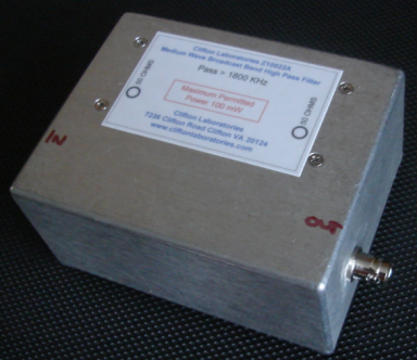 The filter is available in a variety of finish levels including box, waterproof levels and connector choices. I planned to use the filter indoors so I selected the basic case option and BNC terminations. The filter was delivered about a week after order - shipped by USPS Priority Mail. With Chebyshev filters, the roll-off is very sharp and the passband flat, but there is significant group delay delta across the passband. Contrast this to the other common use of Chebyshev filters - narrow band crystal filters. Chebyshev designs have nice tall skirts and a good shape factor. However, here the group delay is a big problem and manifests as ringing characteristics. For a filter in this receiver protection application, the group delay is not a consideration because the "passband" is huge relative to receiver passband.
