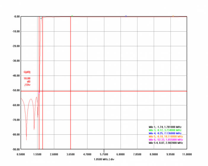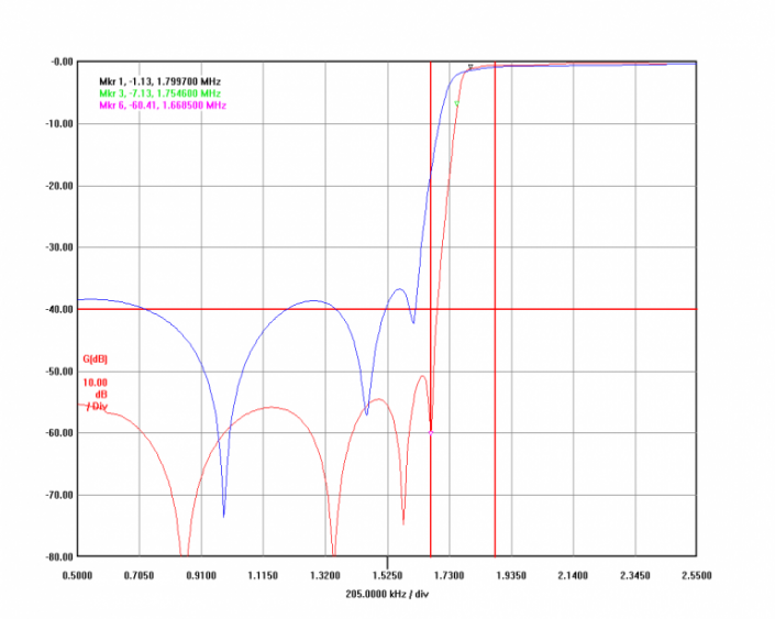 Jack laughed and explained that the filter components are trimmed by hand via adding padder caps or adjusting turn spacing on coils to bring each filter pole onto the exact mark. However, Jack had some great news. He had just ordered the first production lot of boards for a "B" version filter which is a 9-pole elliptical design (vs. 7-poles in the "A" version) and asked if I would like to try that? Of course! The new "B" rev filter arrived in the mail a couple of weeks later and I was able to benchmark both the "A" and "B" versions side-by-side. ResultsLooking at the attenuation levels, the "B" design has about 20 dB more attenuation across the entire AM broadcast band compared to the "A" design. And at 1670 KHz where my local station's carrier was to be found, the "B" rev has nearly 40 dB more of attenuation. While the "A" would have done the job for all but the toughest cases, the "B" literally takes the attenuation game to another level. Very nice results indeed! For more details on all of Jack's filter offerings, take a look at www.cliftonlaboratories.com/current_products.htm Looking at the VNA data, the next graph below is a transmission plot comparing the two Z10023 versions. The "A" version in BLUE color. And the "B" version in RED color. At 1.8 MHz, the filter has a loss of just over 1 dB; and less at frequencies above that.