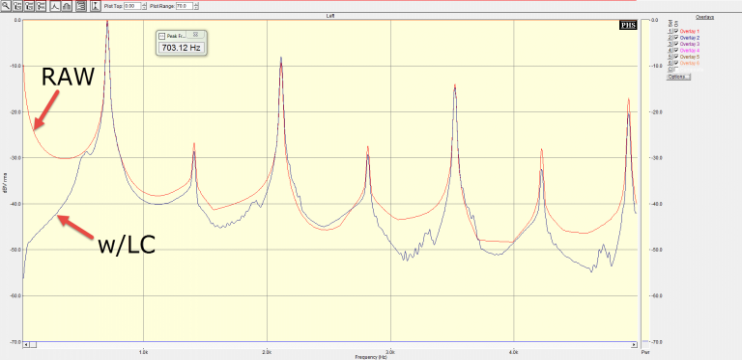 The thump is due to the big DC level offset that is visible at the end of each tone. The AF spectrum of the keyer's output is shown in the graph below - characteristic of a square wave, the odd harmonics are strong and the even harmonics somewhat muted by comparison.
