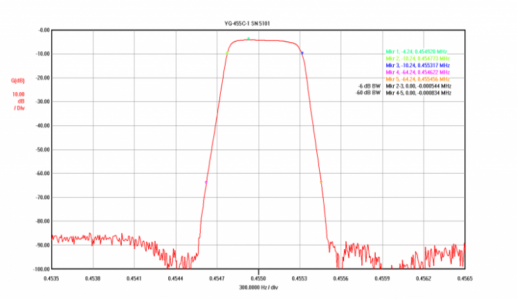 Meanwhile, back at Kenwood Hybrid HQ...I had not progressed beyond the concept of using the -1 filter in the '830s. And at about that same time a message popped up on the Kenwood Hybrid Yahoo group reflector which wiped away any remaining concerns. Chris W7JPG had published work proving this filter would in fact work - although in an indirect maner. Chris used the Collins mechanical 455 KHz filter in his setup (not the crystal one featured here) but because the Collins filter has the same CF as the crystal filter, the results would be similar. Test and check out of Chris's rig was done as part of a restore job by Terry K9TW. Click HERE to view the W7JPG/K9TW Collins Filter Install Notes There were two key conclusions from Chris and Terry's work applicable here. 1) A 455.0 KHz CF filter works as intended in the TS-830s, provided 2) the IF shift control is rotated to about the 9:00 position (which compensates for the CF difference). Why use the crystal vs. the Collins mechanical option? The Collins filter is a very suitable alternative to the YG-455C-1 crystal filter and has had wide adoption in ham gear for decades. It is a bit lower in cost (at that time) and I had considered the option, but decided to proceed with the crystal filter instead because the shape factor would be better thanks to a combination of less filter blow-by and steeper transition band skirts. Additionally, the installation would be simpler as it's a direct mechanical fit with the mounting holes and it would look just like the stock filter. YG-455C-1 Bench Characterization