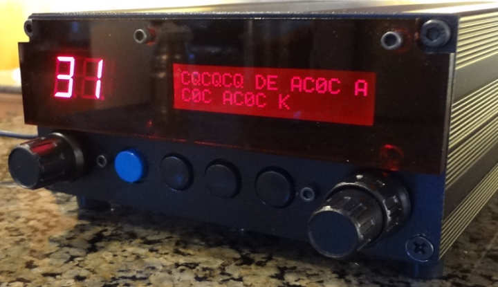 The DDS produces a crisp and clear sidetone but keying the audio line does generate some low frequency content. I added a simple 4-pole HPF built out of a dual op amp in the final build. Components for the HPF were mounted on headers in case a design change to the active filter was needed. The Final Result - For NowThe blue button activates the keyer menu and the other 3 buttons are memory playback. The speed control (left) is a pot. Sidetone volume and tone (right) are mounted on a concentric shaft control. Finding a knob that would fit the pot was tough until I noticed that the knobs on my Yaesu FT-2000 looked about the right size. The shaft diameters were the same and save for ordering replacement knobs on the rig, the controls for the keyer were complete. The final version of the display was the hardest aspect of the project to figure out. Initially I had a black on green back-lit LCD using a separate bezel and a small red transparent covering for the 7-segment LED. The two different displays, sizes and colors really looked poor and then one day I noticed I had a red on black LCD module in the junk box. It was a short jump to conclude that a single uniform red transparent plastic front would give a nicer appearance with the final assembly being what you see here.