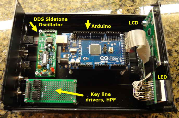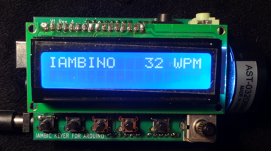 AE9RB IAMBINO http://ae9rb.com/ This is an interesting kit built as a shield that sits on top of the Arduino board. Features include code playback memory, a DDS chip for sidetone generation and an LCD which includes speed. The assembled unit is compact and would make a great travel keyer with a built in speaker as well as a headphone jack. Speed adjustment is done by a pot; other settings are configured by a menu system built around the 5 buttons below the display. Everything on this board worked just as it should have and the construction + programming was simple. It comes in kit form so you only need to separately source the Arduino - no deep dives into the junkbox required. There are some trade-offs compared to a full size keyer with dedicated boards as used in the MFJ mod. DDS tone purity is compromised by noise from the digital circuitry that surrounds it and is really noticable with headphone use, especially when the display is dimmed. Setting the display to off or 100% bright minimizes that effect. On the other hand, sound quality is much better than a square wave driven device of course and for the most part, sidetone on other projects is in the beeper category. W5UXH KEYBOARD + PADDLE KEYER http://qrqcwnet.ning.com/profile/ChuckBroadwellW5UXH