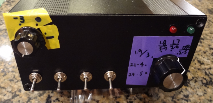 The box as built allows the filters to be bypassed, individually enabled or cascaded with both inline. The enclosure was found on eBay and is an extruded type which has removable end caps and that makes drilling easier. The colored tape is used for now as a temporary label. When the construction is 100% complete, clear Brother label tape will be used for the final finishing step to give a nice clean look. Internally, here’s what it looks like below – wire dress, etc is not done as I want to run it for a while to make sure it’s working properly and that I have the right center frequency for the peaking filter. The toggle switches are clumsy compared to something with a tactical feel but they were quick, in the junk box and met the switching needs. If I were to rebuild the box again, I would use another switch choice - maybe some push buttons driving some latching relays would do the job. There is room above each switch to accommodate a status LED.
