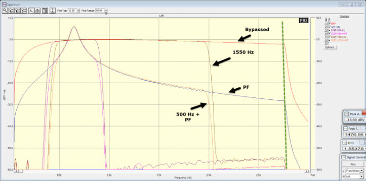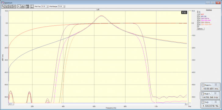 Some measured values of two filter settings: 500 Hz DSP: -6 dB 900/404 Hz BW: 496 Hz -60 978/328 Hz BW: 650 Hz Shape factor: 1.3:1 Peak Filter (analog): -6 dB 584/712 Hz BW: 128 Hz -20 dB 355/1050 Hz BW: 695 Hz Noise floor of the system is about -70 dBc which is about the limit of the test setup. Distortion was pretty low – the signal generator has about 0.5% and prior to clipping no increase was observed with either of the filters inline. THINGS TO DO Clean up wire dress Fix ground loop/hum pickup problem (12V PS?) Final labeling of front/back panels Lower PF filter Fc? Eliminate the audible click when switching PF in/out Consider other switching options to replace the toggles |