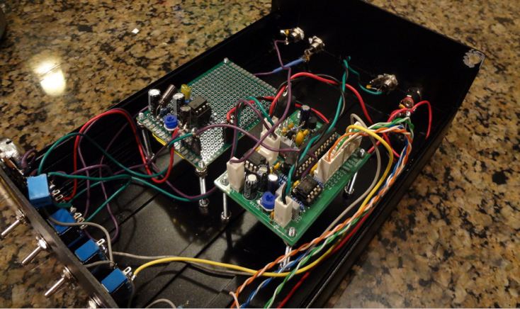 Modern DSP joins old-school analog active-filter for a great Hybrid line addition The Hybrid rigs in the shack are great boxes and fun to play with. But they for the most part lack any of my preferred CW filtering options. The Yaesu FT-102 has crystal filters in both IF strips so you can adjust the bandwidth (BW) and center frequency (CF) as well as featuring an a narrow audio filter located just before the final AF amp so it's in pretty good shape. But the better sounding Kenwoods lack the audio filter and have varying (generally lesser) crystal filtering capability. Contrast this to the more modern filtering implemented in the Yaesu FT2000 which features a DSP IF with adjustable BW and CF, as well as a DSP implementation of the "APF" which has a frequency response almost the same as a Q=10 2-pole active filter. I prefer to use the APF with a bit wider DSP when working the CW bands on the FT2K as the DSP provides the absolute passband limits we have come to appreciate in modern rigs, while the APF provides that signal-jumps-from-the-floor sort of effect that you cannot get with a square-shaped passband DSP filters generally are programmed to provide. My plan has been to put that simple circuitry in a box to use with the older gear and having finally got around to doing it this year, the build looks like the following. TOPOLOGYThe chain is DSP filter --> analog peak filter --> buffer amp --> speaker amp.