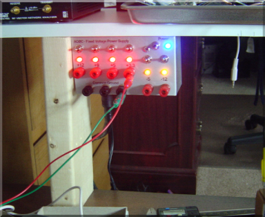 Bench power supplies I’ve been wanting to build bench supplies for a long time and this week I finally got around to it. This supply is essentailly a header for a PC power supply. The intent here is to have a lot of current at the ready, of a few of the most common fixed voltages The PC power supply has all except the +9V – which I provide via an internal 3-terminal regulator. Each line is individually switched and the LED help to provide a visual indication as to what is turned on and what is not. That also ensures that power is cut immediately and there is no "bleed donw" delay. The negative voltages are down-set from the rest of the positive voltage outputs to avoid late night accidental confusion. The power switch is a toggle that activates the entire power supply. Using the PC power supply is a great choice when ultra critical demands are not present. Most modern units feature short-circuit protection, overload, under and over voltage crowbars and automatic overload reset. They are quite robust compared to the traditional linear supply we built back in the day. The enclosure is a 5.5x3.5x2.5” radio shack aluminum box – I really like these boxes – cheap and at the ready. Holes were drilled for all the items, then I sanded the surface to give it a uniform matt finish. The labels are black on clear. And a top coat of a “fog” colored clear coat protects the labels. The slight haze tint in the paint is really great at hiding imperfections.  In this interior view, the 9V regulator is mounted on the back. The wiring is 14ga and the terminal strips serve as a stress relief. Power is fed via a DIN plug mounted at the bottom. All inputs are bypassed at this jack. The rest of the design is unremarkable.  Load test results: Post Voltage Current capability - -12v -11.85v idle 125ma max