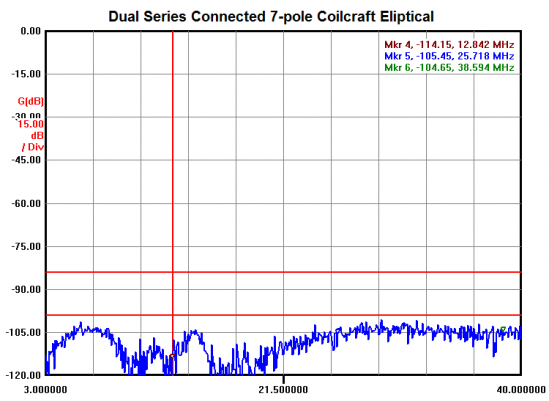 VNA plots of the filter module look like this. For transmission attenuation, with fundamental, F2 and F3 marked. Suppression of -95dbc down on the 2nd and -81 dbc down on the 3rd harmonic: