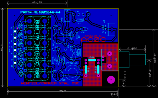 Of course, there will be some leakage in there somewhere and these numbers won't be fully acheivable in reality. But I am very comfortable that the overall topology is sufficient to provide a clean enough test source for the FT-2000 project and the target goal of source IMD products below -100 dbc. I would welcome comments from knowledgable individuals with respect to the setup. Please contact me at the email address listed on the home page. PCB Version of the OscillatorsRob Underwood KØRU has taken the design and is building up some PCB for the final rendering. Differences in the PCB and the prototype versions are: - Use of the 2N5109 for the final output driver/buffer