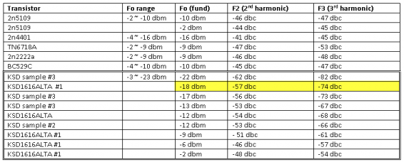 With the added LPF following the oscillator modules, the fundamental signal purity is far, far in excess of what will be needed with the projects at hand. And probably for some time to come. How about those harmonic levels?One intersting note is the effect of the harmonic levels with transistor selection. Initially the prototypes were built iwth the KSD1616ALTA because that is what I had handy. It was not until the official target (2n2222a) was put in, and the harmonics about 10dbc worse than the prototypes, that I started to look more closely. Here's a spread of transistors, at various output levels (as determined by the oscilator voltage feed level set by the trimpot) vs. harmonic levels. Note the consistency of the 40-50dbc and essentially unchanged 3rd vs. 2nd harmonic levels. All, that is, except for the KSD1616ALTA. With all transistors, there is a relationship between the oscillator voltage level and harmonics. But only the KSD showed a lot better 3rd harmonic performance than the others. I have not looked into the circuit or the transistor parameters closely enough to have an opinion that explains this effect. I suspect this is a reflection not of the KSD quality and suitability, but rather of high capacitances and a limited hfe. But it is one of those rare but occasional strokes of good luck that we picked the KSD the first time. The prototypes performance was fantastic vs. our expectations, and regardless of the actual reason behind this specific transistor's performance, the numbers from the BNC jack look just great to this ham!