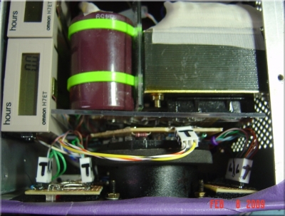 Power Supply ModuleShown here are the filament and key-down hour meters - the vertical beige boxes visible in these pictures. The black transformer here is the filament unit. Located behind the filament transformer is the DC transformer for the low voltage circuitry and fan circuit.