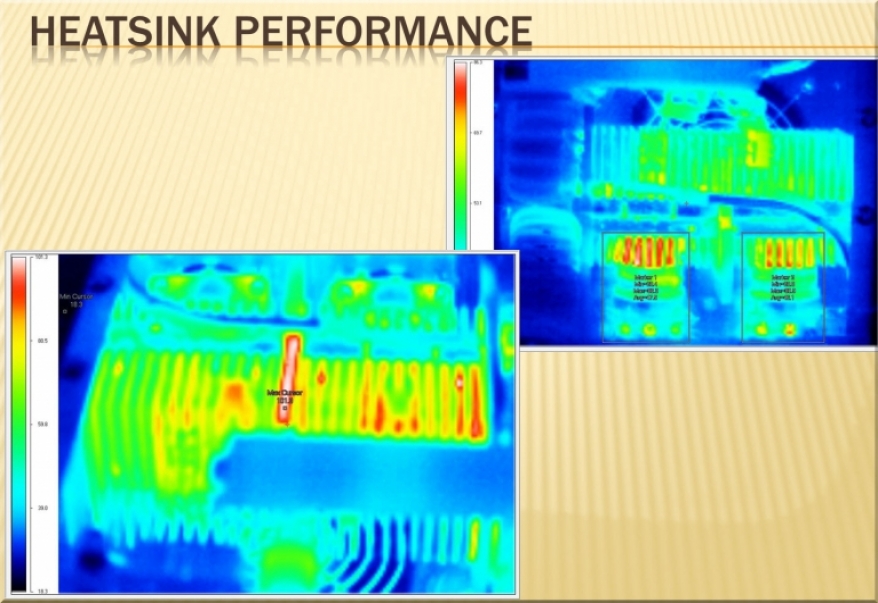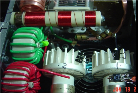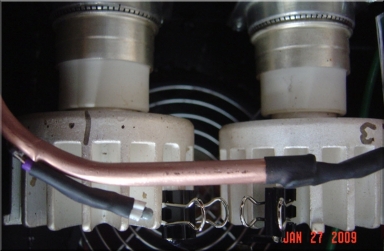 By far the most cool test gadget I have ever used is the IR camera. It provides James Bond style heat signature pictures, along with a very specific temperature reading at every point in the photo. In this picutre we can see the enlarged heat sinks are keeping the tubes much cooler - almost 80C lower. A very valuable benefit of this is that it was the first point where I noticed that the toroid on 40m was heating significantly. Subsequent checking showed temps over 100C.