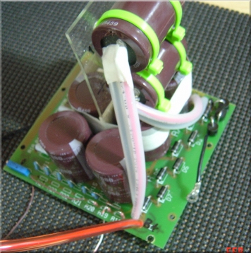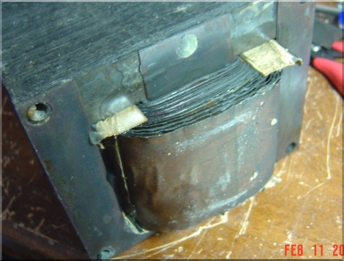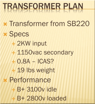 The power supply module is fully removable (picture at right). HV runs are insulated with plastic piping. The original design of the Harbaugh board supported 6 caps but given the higher voltages this amp runs at, a total of 8 450v caps is used. 0.1% 3W precision bleeders are put across each cap to help keep the cap voltage values even. Transformer Replacement - Plan AInitially, the target Sleeper transformer was going to be the SB220. It's slightly larger in size and has quite a big higher B+ idle voltage (2500 vs. 3100v). The stock SB200 transformer was very sturdy and showed only minimal heating in the difficult bench testing done prior to moving to this transformer. Hopes were high that we would be able to get the similar performance at a higher voltage from this SB220 transformer.
