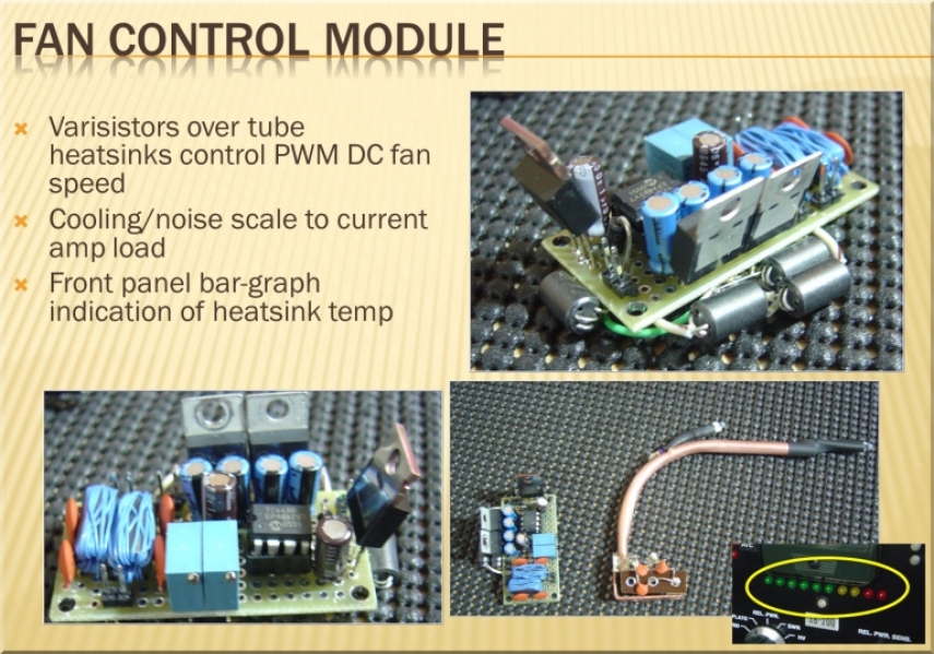 A friend of mine showed me the Acom 2000 - wow, what a nice amp. One of the very best features is that the cooling fans are nearly silent. And the volume of air/noise produced ramps smoothly with the cooling demands. I thought that was wonderful and it's also one of the project goals. I don't mind an amp that makes some noise when it's huffing/puffing and blowing the RTTY houses down. But at idle, who wants to hear an amp fan? Not me. The solution was to put a variable speed fan of some kind. The final solution was to use a IC specific to the purpose. The circuitry is pretty simple but because all inputs/outputs need to be RF bypassed, the complexity and board size increases a bit. Temperature is sensed directly above the hot spot of each tube via theristors. One for each tube, in parallel. With the two sensors in parallel the warmer of the two tubes tends to set the fan speed. Given the somewhat offset position of the muffen fan with respect to the cooling fin layout, the tube on the right tends to run warmer than the tube on the right. The fan circuit is active regardless of the power soft-switch which allows the fans to keep running until the cut out temp is reached. The operator does not need to wait for the fan to cool down before hitting the power off switch. I have tried several fans in this position including a 300 cfm 24V unit that is just fantastically powerful. However the noise profile of that fan, even at low speeds, is pretty loud. In the final version, I will probably end up using about a 200 cfm unit as that seems about the best overall compromise between low idle noise and capable high speed volume performance. A small sister module built from a LM3814 sits on the back of the front panel providing bar-graph LED indication of temperature. This module takes it's input voltage sense level from the varistors as well and provides a convenient front panel indication of realitive temperature. By adjusting the slope and offset of the LM3914 input, I can have the bar graph correspond to actual temperature warning levels if needed. This combination works fine in it's current implementation. However, I plan now to replace all of these individual seperate modules with a small MCU module based on the Atmel AVR. That would give me much more control over the "personality" of the amplifier and result in a far less complicated circuit implementation. This is counter to traditional amp design philosophy - but for my case, the weak spot is not the semiconductors used, but rather the number of fragile interconnections .
