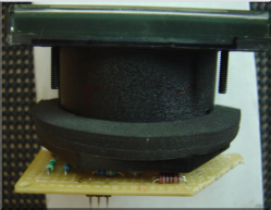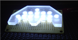 The module mounted to the back side of the front panel multi-function analog meter is a white backlight source. I could not find a "light bar" of the proper dimensions and constructed this one instead. The LEDs are filed flat and countersunk into the plastic. A "fog" colored pain was applied to provide further diffusion of the light. The cutouts allow the meter to sit over the terminals and just above the production diodes. A foam surround wraps over the top of the meter to increase the contrast by suppressing light that would project upward through the top of the case. The overall visual result is excellent.