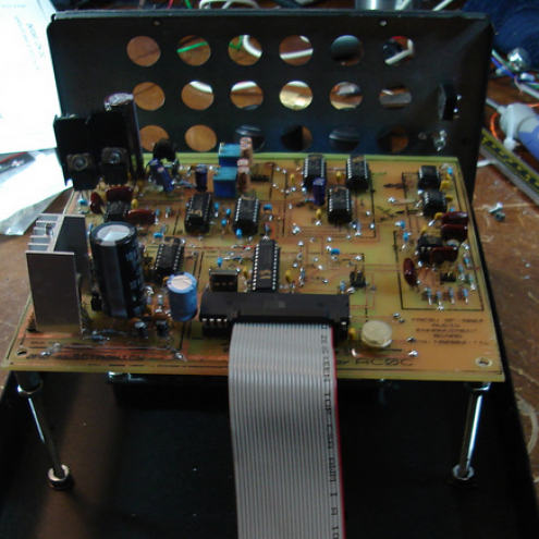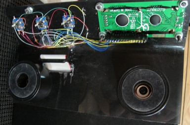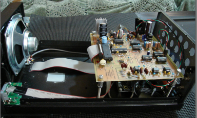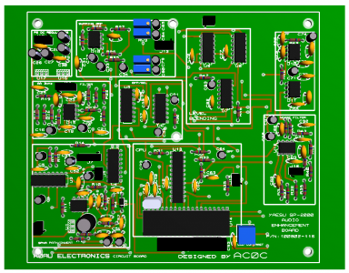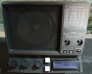 The enclosure for the project is the Yaesu FT-2000 companion speaker SP-2000. In the stock orientation, it has some LPF and HPF capabilities that are performed on a passive basis. All of these items were removed in the mod process. I never did find a use for those two original rotary switches so I guess they will just sit there and look pretty. I used up every single IO port on that chip and so I can’t use these for quick preset or something like that. Hmmmm…. Now if I were to hang a port expander off this CPU, that would give me an extra 16 I/O lines and I could add a lot more knobs, buttons and switches!!! The filter's control section (above, right) was built onto a Lexan face that extends below the front plane of the speaker and at a tilt thus avoiding modifications to the stock speaker facing. The reason for this was practical; I could not find a way to mount the controls on the existing surface where it would look nice. The stock 1/2 input switch now defines which of the two “paths” the filter is in so I can use the filter with either the main or the sub RX. The AA/NF and other 3 kHz BW filtering (8 poles of LPF total) is fully time on both paths. So only the BPF and elliptical LPF module flips from one side to the other. The mute switch flips the feed between the two speakers (one internal, one external). Normally I would run the main into this speaker and the sub to an external speaker. The mute switch will let me reverse these two because the external speaker is not as ideally located near my head as the main speaker in this box is. I will label the front panel when the code is a bit more worked out. That’s one of the cool things about the AVR doing the interface work – you can determine the functionality of the controls later as it’s not hard-wired for one certain way… Presently the two gray colored push buttons enable/disable the LPF or BPF filters. Rotary controls set LPF frequency, BPF frequency and BPF Q. Each of the rotary switches have a push button built in which are tied to additional functions. All of these The ribbon cable pokes out of a relief cut into the Lexan/steel. Interestingly – the screws that some guys though were uncosmetic turned out to serve a very good functional use. The bend angle is just right so that the screw touches the desk surface. When pushing the rotary encoder switches, the Lexan flexes and gives a fuzzy feeling to operation. I noticed there was none of this near the LCD (it had 2 screws already) and so I added a 3rd screw on the left. Now the force of the push on the encoders is absorbed by the screw contact with the desk. I will have to remember to put a bit of something on the bottoms of those screws to avoid scratching my precious desk. Actually, the ideal solution would be to find some encoders that had a lighter touch on the center push button, did not have detents but did have some “drag” when you turned them and also had thread-mounts and kerneled shafts. But I have been looking high and low and it seems that beast just does not seem to exist at least that I’ve found.