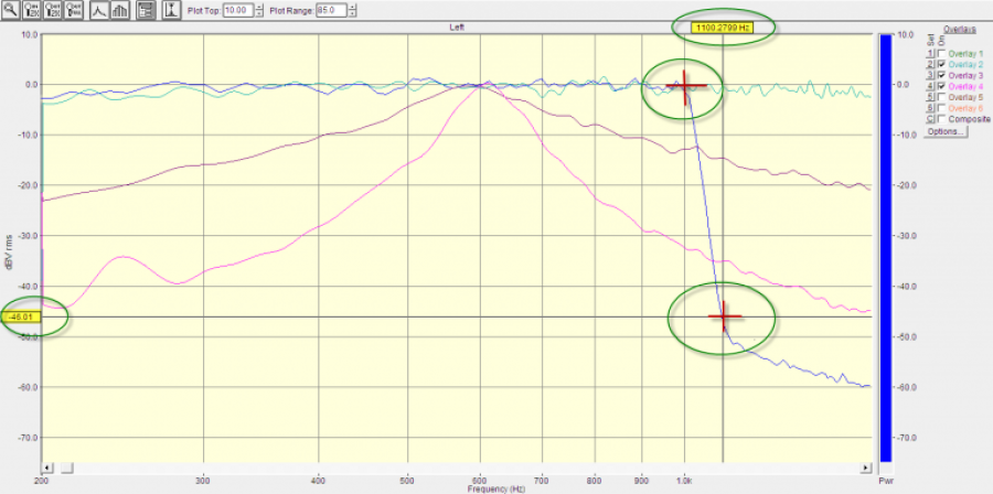 Zooming into a tighter range of 200 - 1500 hz span, we can see the effect of the HPF roll-off. -46 db down at Fc+100 hz. Performance on par with the rig's DSP. The low end is not considered because the 1K-mod combined with the IF shift on the 2nd RX allows for the similar steep roll-off on an adjustable basis.  In this graph we can see the combinational effect of the two filters used together (the BPF and LPF). From this graph it's easy to see that adjustments in the Q of the BPF, and in the Fo of the LPF, will allow the shape and the roll off to of this filter combination to exactly match the main rig's DSP APF (the low end is contained by the rig's 2nd IF filter). In that sense, one of the project goals of providing a 2nd RX APF feature that matches the main is realized.