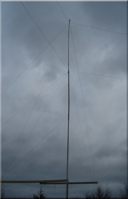 The vertical is guyed at 2 levels. The 3rd and lowest guy set seen in the picture is part of the derrick arrangement (described more below). The vertical is constructed from scrap bits of pipe and is about 2.5" at the base, tapering to about 1.5" at the top.