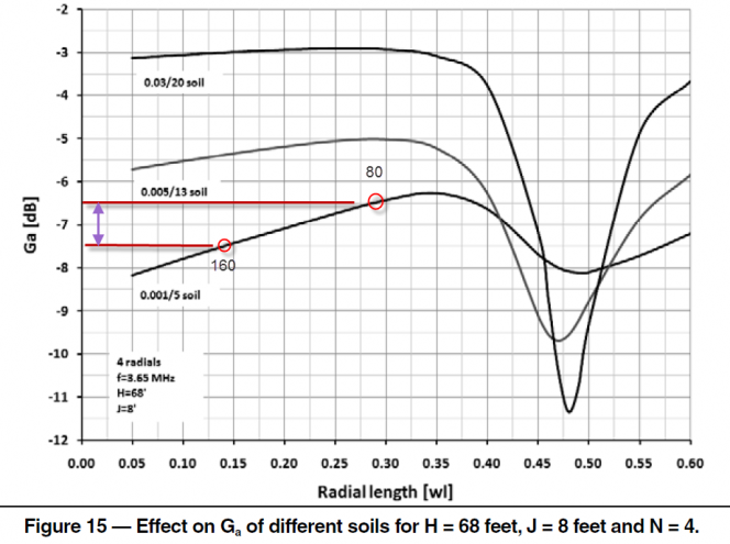 The radials can be of any length - N6LF showed that deviations far away from quarter wave provided very little penalty. There is some impact on performance depending on length. However, the advantage to using non-resonant radials is significant and in my assessment, easily overcomes the very small potential performance hit. The advantage of using non-resonant radial lengths is that electrical symmetry (equal currents in all radials) is much easier to achieve. A quarter wave radial has a very low impedance relative to non-resonant lengths. As a result, a small change in length between nearly resonant radials creates a large change in current sharing between the radials. Its likely the case that even with quarter-wave-length radials that are measured to be the same length, small differences in the ground, variations in length, tension and other variables would all conspire to result in uneven radial currents being present even in the most careful installations. This sensitivity is easy to confirm in EZNEC. Radials longer or shorter than quarter wave have a much greater impedance by contrast. In this case, the same physical change results in much less of a current sharing change. An article by K5IU really helped bring this item into focus for me. Note that radials other than quarter wave will contribute some amount of reactance - but this is easily offset by altering the length of the vertical element a bit to restore Xj=0. For this antenna, the length of 74 feet was convenient given the location of the radial support studs. That's slightly longer than a quarter wave on 80m, coming in at about 0.28 wave length. The same radial serves well on 160m also; coming in at about 0.14 wave length long. As we can see from the chart below (from the N6LF QEX article), the penalty on 160m for the 0.14 WL radials is around 1 dB (worst case assuming poor soil). If the soil is average or good (as is the case here in farm country), then the loss is much less. This means that the length of the radial at 74 feet is workable for both bands, and contributes very little to additional loss (even on 160m) and will be much more robust in current uniformity.