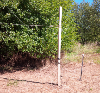 Supports for the elevated guys are built from 2x4x10 treated lumber set into the ground about 2' deep. A small T-post is driven into the ground behind the 2x4 and takes the load from the elevated radials. For the 4 points serving as guy anchors, the ropes tie low onto the 2x4 as seen here. Nylon zip-ties provide about a 6" insulation gap from the end of the elevated radial tip to the bungee cord. The bungee keeps tension on the radial but they need to be replaced each year as they quickly degrade in the sun exposure.