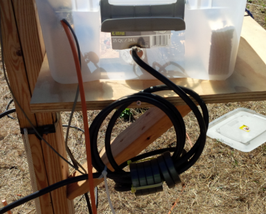 The L/C matching network is housed in this plastic tub. Bungees keep it from being blown off the support in the wind. The elevated radials do not have a ground connection here at the vertical, but do see an earth connection at the 2x6 switch by the tower, on the other end of the RG11 run.