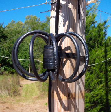 Shown here are the common mode choke for the relay switching line (top arrow). It measures about 5K ohms on both 160 and 80m. Below that, in the black heat-shrink tubing (lower arrow) are the static drain chokes (2x 250 uH) and resistors (2x 2.7 K). The resistors are too low in value but that's what was in the junk box on hand. I'll have to change them to something bigger later. The other end of the resistor is tied to a wire running down the support post, and connects to a 4' ground rod driven in at the base. I had not fully appreciated the static build-up until I happened to pick up the relay wires a few days prior, just as a storm was coming into the area. I can say without any reservation that the wire tested positive for high-voltage according to the nerves on my hand!