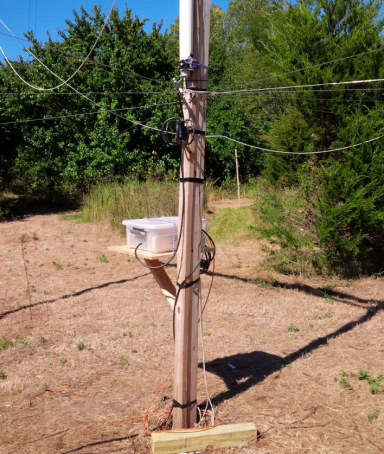 The top of the vertical has a bit of PVC mounted on the end; the relay is mounted to that. The PVC was left from the prior trap use and was convenient in that it provides some insulation function between the relay, vertical top, and the cap hat wires. The top-most guy wires are tied to the mast just below the PVC pipe (not visible in this photo). The gray colored control wire is visible here. It runs down the length of the vertical on the outside; taped in place every 10' or so. The cap hat wires are supported by the guy ropes by bits of electrical tape. Near the top of the vertical, the cap hat wires are tied together and taped onto the neck of the plastic bottle shown here.
