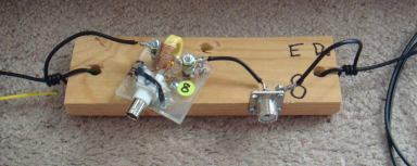 Dry wood is a FB insulator and that's what I used for this build. The board provides a good mounting place for the sensor, the SO239, strain reliefs, a mounting hole - and later, terminals for the hairpin match. Shown here is a completed DE board, ready for use.