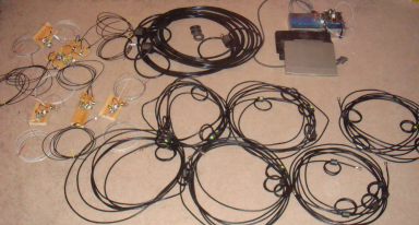 The final kit for all 3 sets of 10m beams is shown here. It composes: 6 dipole assembles, RVM sensors and cables, coax feed-line with chokes mounted and the RVM mux board and VNA with laptop.