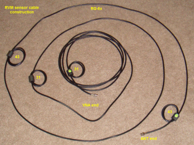 The RVM sensor cables need to be decoupled. In this case, I used 4 1.25" ferrites - with 3 turns per used. A type 31 is placed on one end and in the middle. And about 3/4 along the run toward the RVM sensor end and at the end are type 43 ferrites. The performance of the 43 and 31 on 10m is about the same. I used the 43 on the antenna end because I had the 43's in the junkbox and wanted to clear them out.