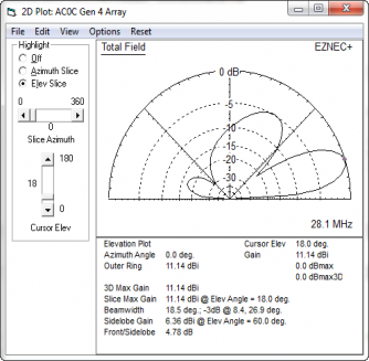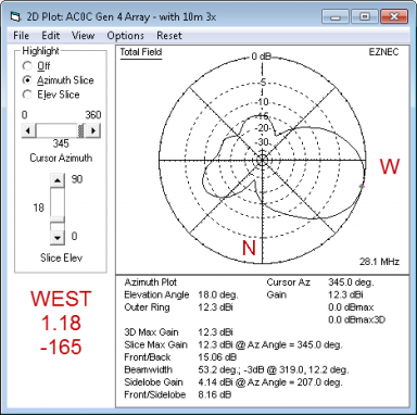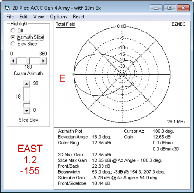 The model has tight coupling - running about 153 degrees of phase shift between director and driven element. And in the SWR plot, the effect is seen in a lowered feed-point resistance. Around 20-25 ohms at resonance. The modeled performance of the East beam inside the full model (with all other elements included) is: