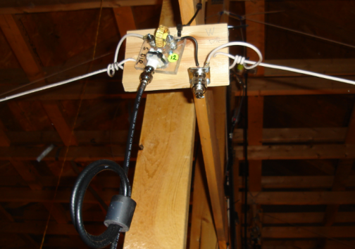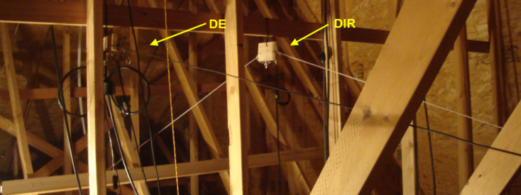 Here the N-S dipole can be seen running the length of the attic "boom." The coax coils left of the dipole are components of the 160/80/12m dipole.