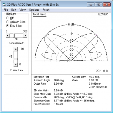 With the new location, the west beaming pair results were much better. The director assembly is shown in the photo (right). Tuning still proved to be quite difficult but a final solution was found that looks good. Final feed-point resistance was about 12 ohms resistive and hairpin adjustment was critical. Measured current/phase values across the band of interest for the two beam pairs are as follows: East ============== 28.0 1.28 -151 28.1 1.20 -155 28.2 1.13 -158 West ============= 28.0 1.47 -159 28.1 1.18 -165 28.2 0.99 -169 And placing the 28.1 MHz currents into the combined model as current sources, provides these modeled plots below. Note that these plots show predicted radiation pattern based on the actual measured currents present in the antenna as built - and to the extent the model represents the environment, it should be "real." This of course does not include the non-modeled items like the stucco wall, or any of the things physically surrounding the antenna (roof, AC venting, Romex, etc). But it is likely the most accurate estimate of the actual antenna performance possible under these circumstances.