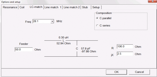 After trimming for resonance, the 10m dipole had a pretty high resistive feed point value. The model predicted this as well and it's due to the proximity of so many other wires. The solution was a simple L/C lumped match. I measured the Rs/Xs with the VNA and then used the L/C match tool in MMANA-GAL to find values.
