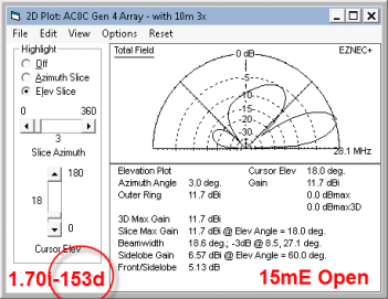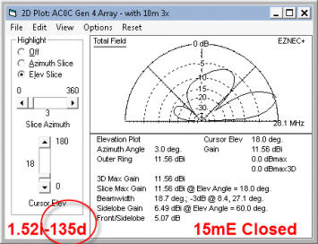 Adding Stubs into the Relay MixOne design refinement with an So2r application is to consider the various interactions of the adjacent operating bands. And to simplify things, I assumed that operation would be on adjacent band pairs. So 10m-15m and 15m-20m were expected operation pairs, but (for example) 10m-20m would not be - with the thinking that I would want to run the two highest bands that were operational. The prior design used relay switching to determine element operation "state" - director or reflector for the 3-element designs and directory or open in the 2-element design. This works very well in the So2v or So1r single rig use. However, with the higher bands 20-15-10, there is some interaction between elements on adjacent bands. The interaction can be tuned around if the element is static, but for So2r it's not as easy. For example, on 15m, there is some interaction with the 20m beam elements. The 20m beam elements will be configured as "closed" when operating as a director - or "open" when the beam points the other direction. The adjacent 15m element will couple differently with this 20m beam element in different ways depending on the open/closed value. And the change in coupling will cause the 15m antenna phase relationship to move around. The same situation impacts the 10m beam as the 15m antenna direction changes. An example of the fixed 10m east beam changes - as the adjacent 15m east element is opened and closed - is shown below. In this example, the elevation plot and F/B sees minimal change. However as can be seen from the red note comments, there is a roughly 18 degree phase shift change. That phase change will result in SWR changes as well. In most of the other close-spaced beams (including the 15m 2-element design), a phase shift of 18 degrees will result in a more significant change in F/B.