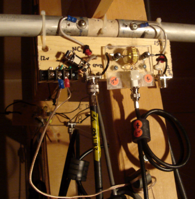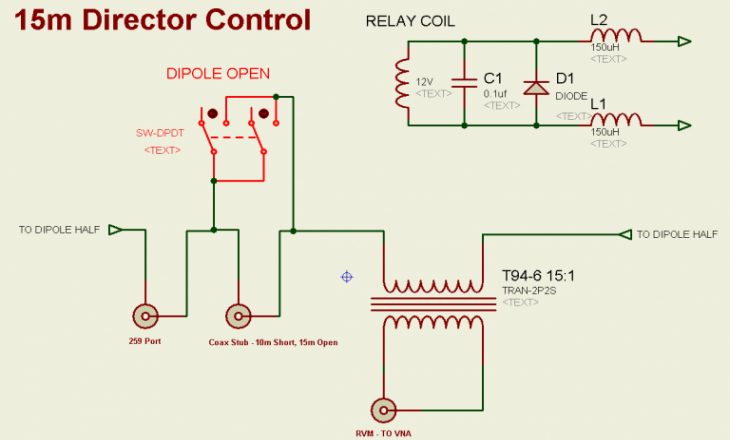 The control structure which facilitates the directional control is present on each director and has this circuit: Notice the inclusion of an extra SO239 for easy connection of the MFJ-259 for preliminary tuning. And the RVM sensor tap for phase magnitude/angle monitoring for use in fine-tuning the antenna - and verifying the operation of the stub/relay decoupling action on the up-next-for-modification 20m beam.