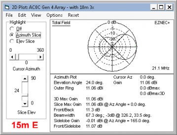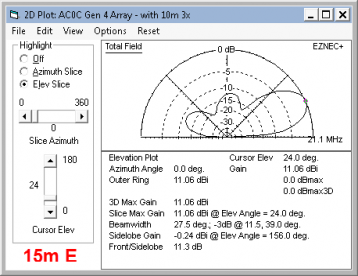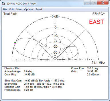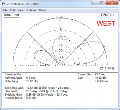 . ModelsEZNEC+ predicts the following characteristics for the azimuth and elevation. First beaming east, then beaming west. Compared to an "ideal" antenna (meaning a 2-element at the same height, over same ground), the gain looks good and F/B is acceptable. As with the 10m beam, it's hard to get a "clean" backside rejection with all the other wire around.