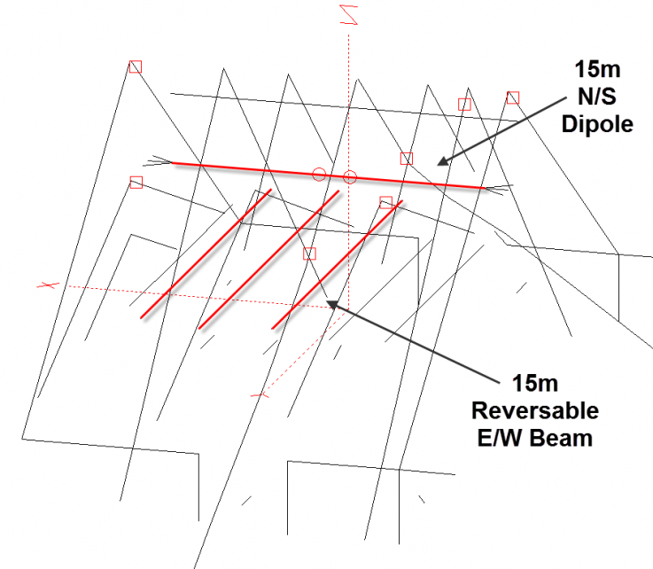 In the recent ARRL RU contest, the 10m dipole addition worked out very well covering the NNW route to Japan and the SSE route to South America. And at the same, the 15m beam's nulls were very evident with poor JA/SA results. What was needed was a similar dipole treatment for the 15m beam to provide some much needed side null fill. DesignThe available location for the dipole was above the 20m element apex which puts it physically along the upper horizontal rafters. The dipole is pushed up against the east wall to maximize spacing from the west side stucco wall. With only 20 feet of available "beam" length, a full size 15m dipole would not fit. So a fork-shaped capacity hat is fitted on each end to shrink the overall length to about 17 feet.