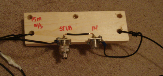 Construction is unremarkable save a facility for series stub connection. The models predicted little interaction with 10 or 20m antennas but in the event that becomes an issue, the shorting plug (shown, left) would be replaced by a stub. A 20m and 10m notch would be provided by a half-wave open series stub with the plot shown in the graph below. Of course, traditional shorting type stubs can be fixed to the drive point as well.