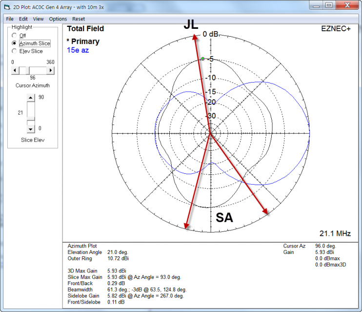 With the addition of an additional antenna switch, selection of the beam or dipole can be had via an OMNI line. The OMNI signal for either rig A or rig B is provided by the attic So2r controller. See this link for details. Model PredictionsThe AZ plot below shows the beam pattern (blue line) and the dipole (black line) in overlay. The dipole has 5db less gain compared to the beam . But on the NNE route to Japan, and the SSE route to South America, the improvement of the dipole over the beam is as much as 15db in the beam nulls. The model shows interactions with the 20m beam at -25 db or better. And close to -30 db on the 10m dipole.