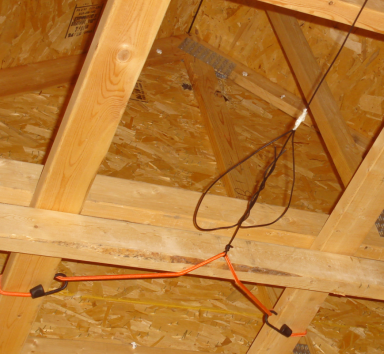 The antenna trimmed up very nicely although it was a bit shorter than expected . As a result, the full extension of the capacity hat was not needed. Shown here, a bungee cord provides the mount and gives a few inches of stand-off from the stud. The ends of attic antennas need to be spaced away from the wood to avoid capacitive coupling. Because attic wood is dry, it's a great insulator and does not provide much of an RF coupling factor. However, while the coupling is very low, it's not the same as air. So avoid running wires close-spaced and parallel to the studs if possible. And be sure to stand off the ends by a few inches.