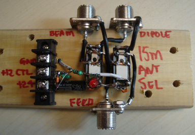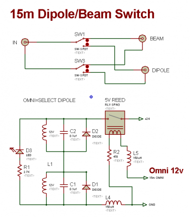 Beam/dipole switch shown here. The relays are buffered by a small reed relay to reduce current sourcing as the logic is driven by the rig select lines off the shack BPF filters. The overall switch logical function is DPDT. However, because of the frequency and current, a single relay is used for each the high and low side of the coax line to provide more headroom. The control line is driven off the attic So2r controller 15m OMNI line. |