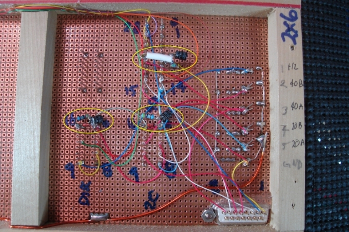 Build The board is built in a similar fashion to the main relay control board - a vector-board-style breadboard mounted on a wooden structure for strength and depth. Terminal blocks and the DB-15 allow for easy removal - the attic is a bad place to perform board repairs... The board is over-sized to allow room for some future idea if it comes up - and only 7 of the DB connector's 15 I/O are used. An unused relay socket is in place. And a dual set of 8-conductor cables has been run up to the attic from the shack - this board will utilize only one of the cables; leaving some spare capacity in place there as well. For the simplicity of the circuitry, the board is mechanically more complex than one would expect but this build style is helpful from a physical strength standpoint - and with the LED/labeling, easy to troubleshoot even after some months have passed and one has forgot what the configuration was initially. The LEDs are of a high brightness variety and will show some visible light when exposed to RF on the supply leads. This has turned out to be a very convenient assistant for identifying RF on the control lines as the attic lighting is turned out, the rig + amp is keyed with the help of an assistant - and then I look for which of the LEDs are lighting. Adjustments in the wiring or ferrite chokes is made until the LEDs no longer show visible light. This does not address common mode "board level" bounce overall but it's proven to be a workable solution in the context.
