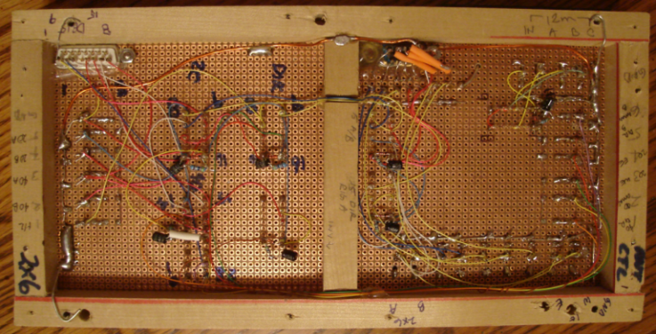 Wiring is point-to-point using wire-wrap techniques. A few of the components are solder and connected via their leads (mainly the I/O filtering and LED).