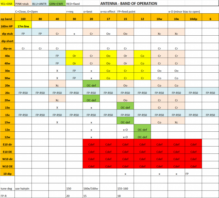 The spreadsheet below provides an insight into the various combinations required. Generally speaking, the array is mostly decoupled through stubs now for the So2r contest bands. And hard-decoupled via relay on the WARC bands. More specifics for the stub/relay combination used is covered under each of the individual antennas in the tabs to the left.