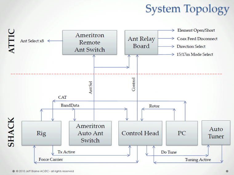Shack Mounted Control Module The heart of the system is the control module. It's tied into the rest of the shack hardware as summarized by the topology in the drawing below.