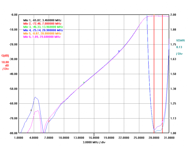 The two filters are mounted in the shack on the right side of the desk table which has become the "command center" - shown at left. Above the two band pass filters are visible the MFJ-998 auto-tuner and the Alpha 76pa. Initial Finished Board Attenuation Plots Two lines on each graph represent the two filter sets. These generally line up closely - variations are due to differences in tune and coil winding primarly. VNA plot measured data shows: Marker 1 - Minimum loss frequency Marker 2 - Low side, 1db down frequency (except on 15m, where it's 2 db down) Marker 3 - High side, 1db down frequency (except on 15m, where it's 2db down) Marker 4 - Ajacent band attenuation Marker 5 - Ajacent band attenuation Marker 6 - Ajacent band attenuation Marker 3 - Marker 2 : calculation of the -1db bandwidth of the filter passband 10m BPF